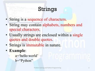 – Strings: In Python, strings are a sequence of Unicode characters. They are represented using the str type. Strings are versatile and can include any character, including printable characters, whitespace, digits, special characters, and non-printable characters. All string manipulations, such as concatenation, slicing, searching, etc., are performed based on Unicode characters.